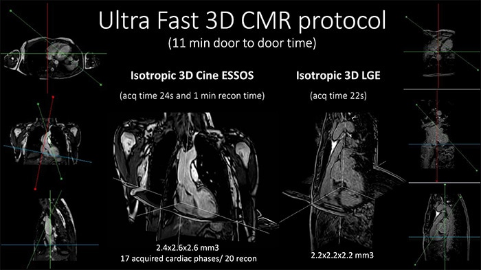 During a conventional MR cardiac examination, patients are required to lie still inside the bore of the scanner for about one hour to accurately measure the function of their heart and assess the extent of damaged heart muscle. It requires multiple complex 2D and 3D image acquisitions that need to be captured and reconstructed. As a result, despite being non-invasive and involving no radiation exposure, MR imaging is still not widely used for cardiac imaging.