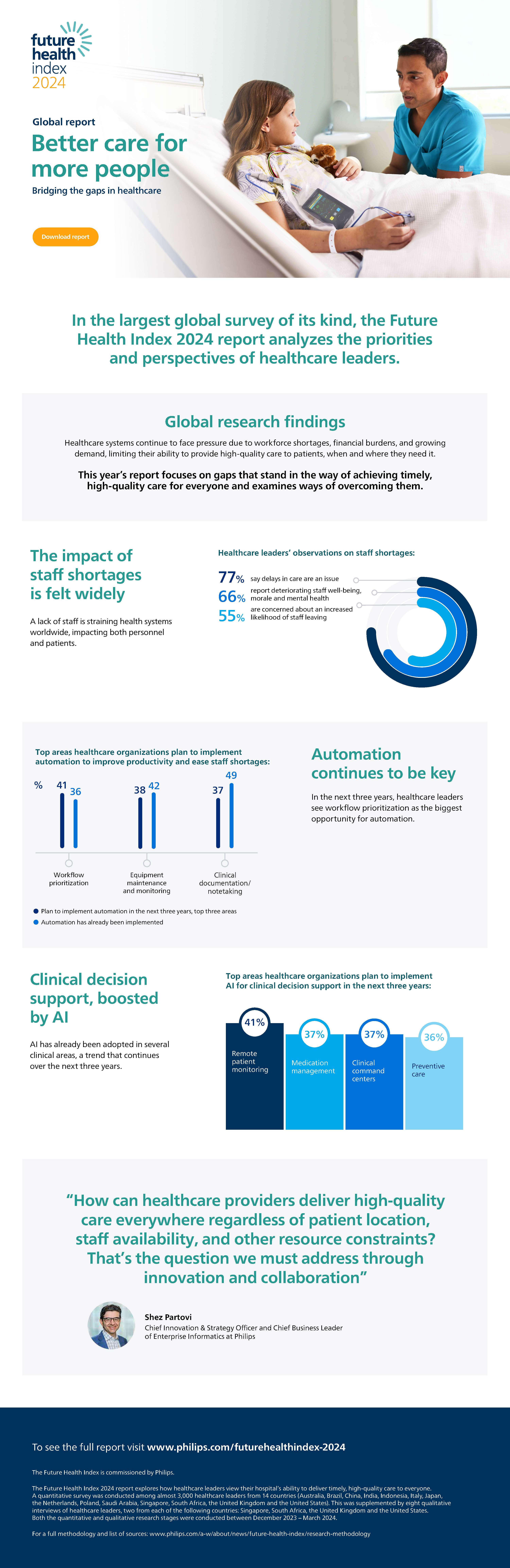 “Increasingly, we’re seeing long wait times and staff shortages making it difficult for people to get timely access to care when and where needed. The Future Health Index 2024 global findings show health leaders believe these barriers to access to quality care are getting larger,” said Shez Partovi, Chief Innovation & Strategy Officer at Philips. “This year’s report shows how innovations including AI are helping to free up time for staff and reduce wait times for patients. However, as health systems roll out AI tools to save time and reduce barriers to care, it’s critical to bring staff along on the journey to ensure an inclusive AI rollout with patient and clinician experience is at the forefront.”